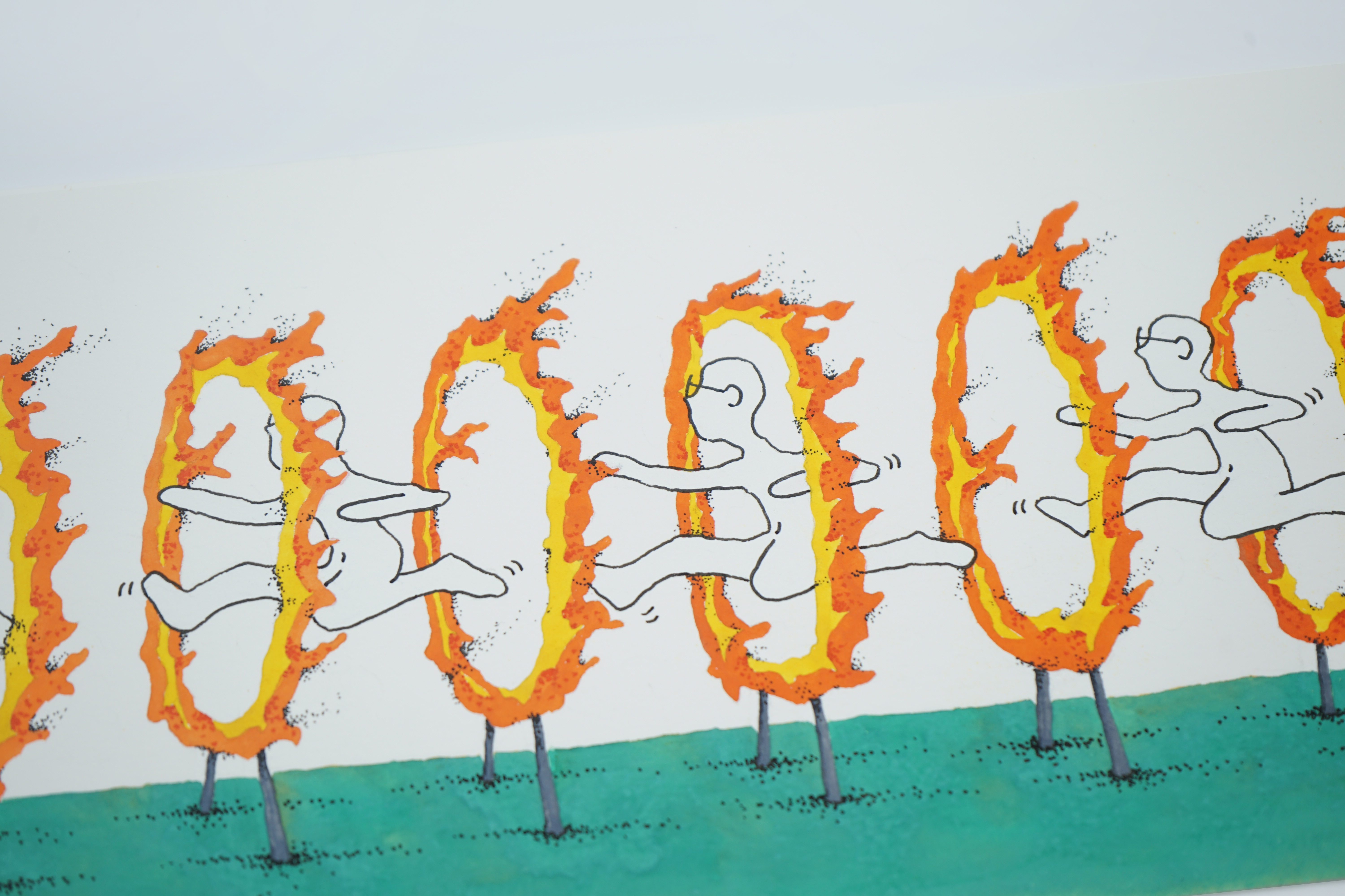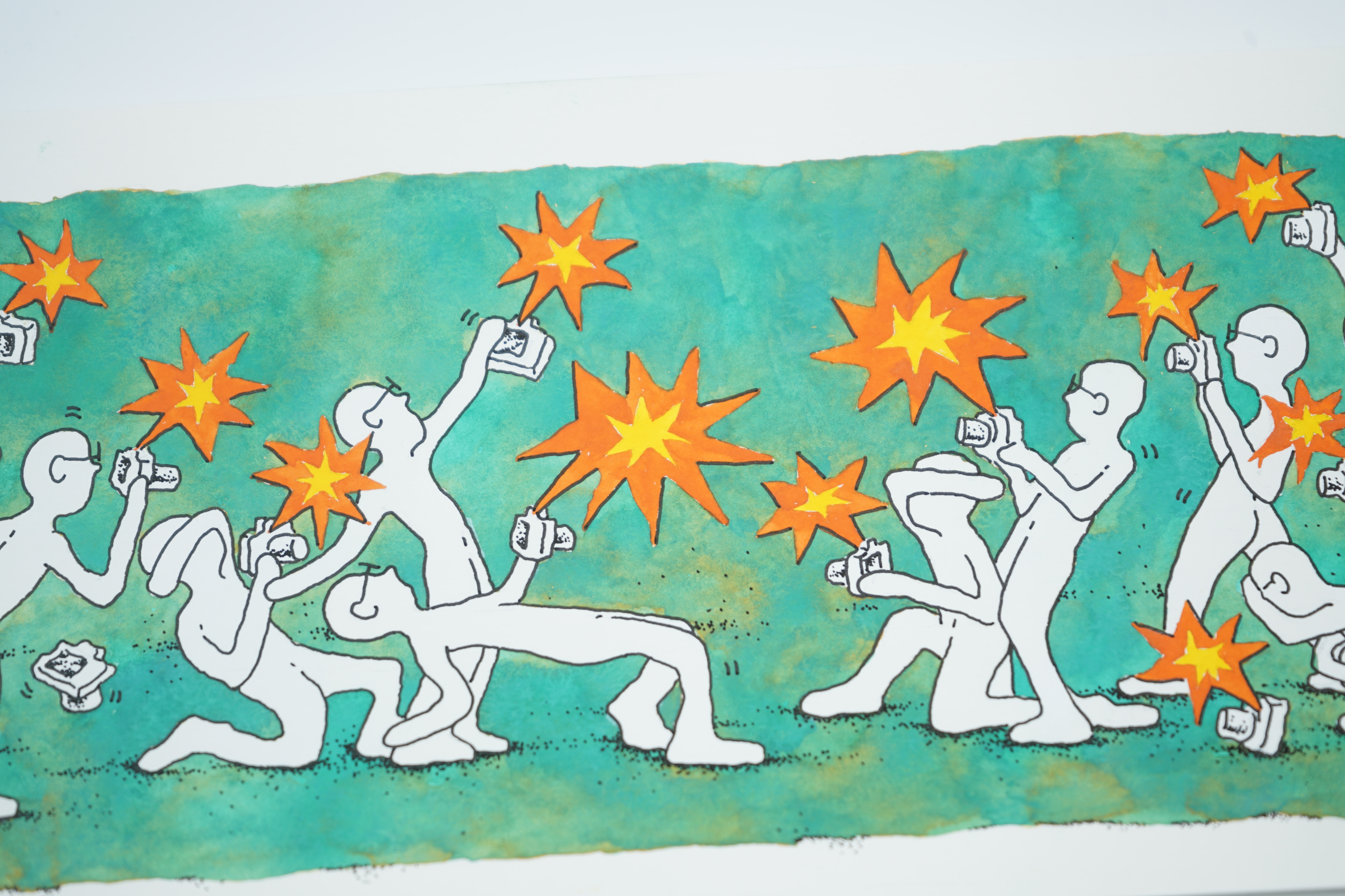 1. GREEN CRUTAIN-Duel 380mmx130mm watercolors 2. GREEN CRUTAIN-Family Photo 380mmx130mm watercolors 3. GREEN CRUTAIN-Racing 380mmx130mm watercolors 4. GREEN CRUTAIN-Headcloth 380mmx130mm watercolors 5. GREEN CRUTAIN-Plastic Chair on the Street 380mmx130mm watercolors